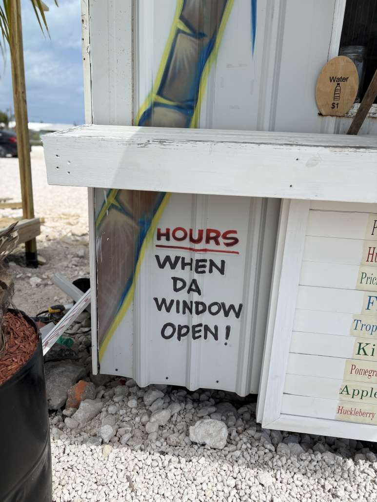 Cheryl found us a great AirBnB in Marsh Harbor on Abaco, the largest island. It was on a hill overlooking the bay so we had a great view. We also rented a car, which meant I got to pull out of the airport onto the highway while remembering to stay on the left side! The car was a pretty nice one for a rental in the Bahamas, it was about a 2004 Buick, with only 160,000 miles, with one warning light on all the time, another one that only came on once in a while, and a front end that rattled like a box of spare parts every time we hit a rough spot. Which was all the time as the roads there are simply incomparable to US roads. Rough as h***, all the time. Not to mention narrow. But hey, the AC worked! Driving on the left was no problem, Cheryl only had to yell at me in panic a couple of times when I ended up in oncoming traffic. Another feature of driving there is that there are no maps. No one had a paper road map of the island. Cheryl figured out how to download a google map of the area we were in when we had wifi and use that, or we’d still be driving around looking for our AirBnB. There may not be any maps because there are no street signs, or stop signs. When you come to an intersection whomever is bravest goes first. There is no mail delivery, no pizza delivery, no Amazon. Our host told us how to find our house by giving us GPS coordinates. Next time I guess I should bring my sextant.