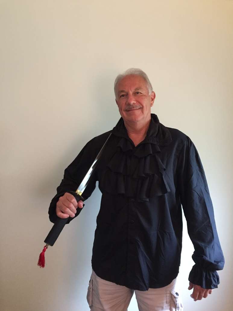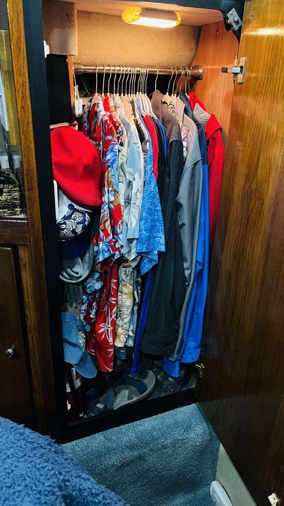 Recently I started moving some clothes aboard. The thing is, I want to look stylish as we travel, after all Cheryl always looks good so I need to keep up, but I have maintained the same look now for what, 40 years? Cheap tropical shirt, shorts in the summer, jeans in the winter. My closet is entirely tropical shirts. I own two or three solid color shirts, in case I have to go to a funeral or rob a bank. Every time I go in a store, no matter what I think I’m going to buy, I come out with another tropical shirt. Even my local Rural King now carries tropical shirts, so a run for plumbing supplies means another tropical shirt. So this should be easy, right? Grab a handful of shirts and go. Once I got started taking clothes to the boat it only took me about an hour, by which I mean more like a week. I took shirts, some backups, cold weather and rain gear items, and bam. Thought I was done. Then I re-thought things. I have rough working-on-the-boat tropical shirts, casual dinner type tropical shirts, and nice silky tropical shirts. How many of each? So I took some back home, took new ones to the boat, and repeat until done. By which I mean probably until the day we leave. As you can see in the photo I managed to cram my closet full. Then I decided I needed to take at least one Pirate shirt. After all, if you take boating seriously, it means a guy needs to be prepared. For some reason this cracked Cheryl up. She gave in on the shirt but drew the line with the sword.