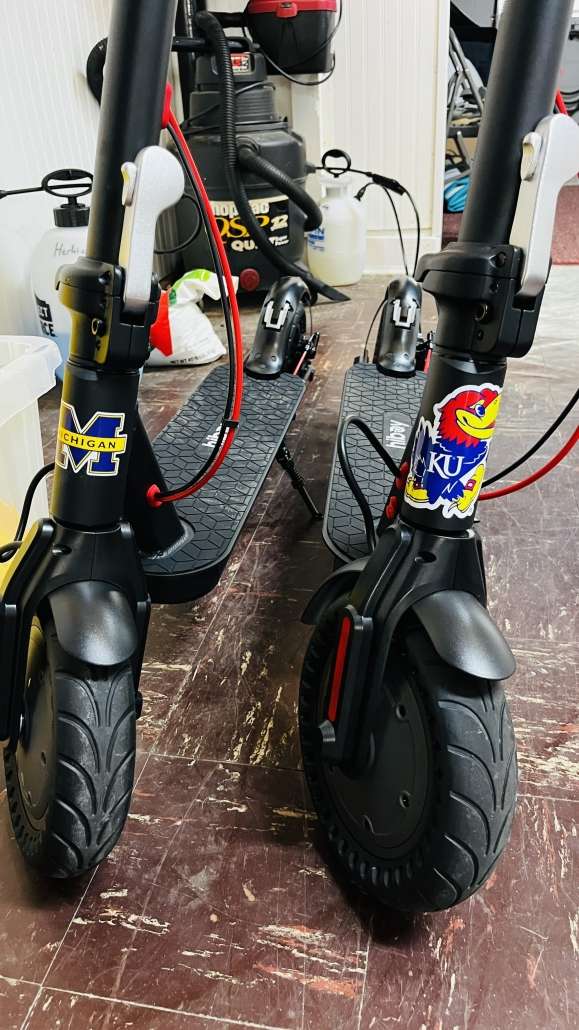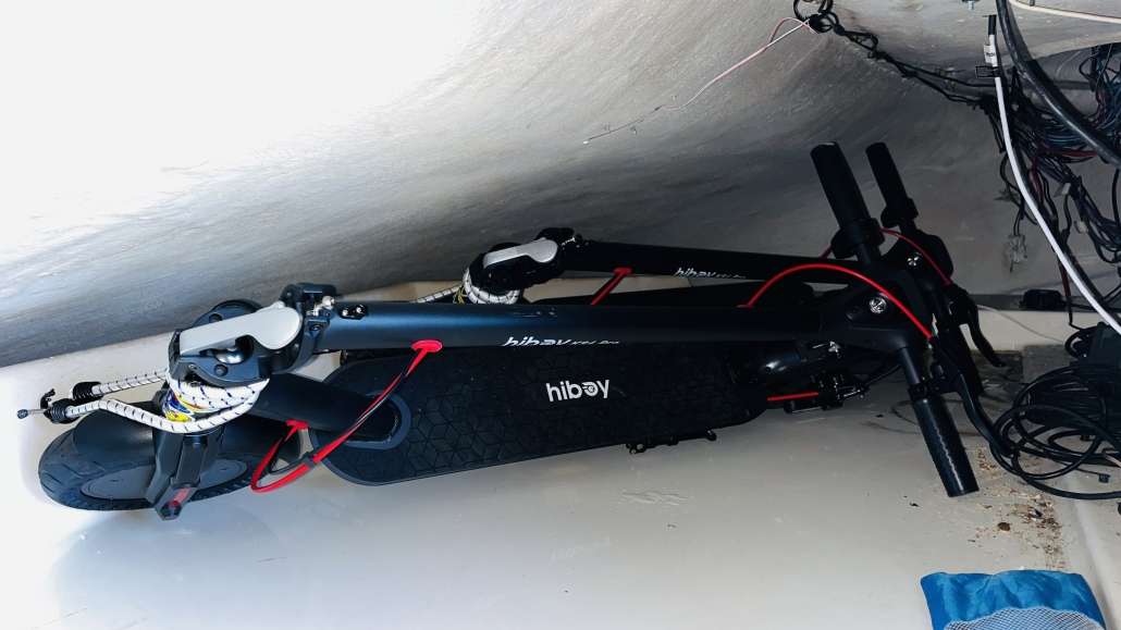 It is kind of fun walking around the house and thinking about what to take along. My drums were ruled out immediately, not only for the space they’d take up, but because I’d like to make it all the way around the Loop with Cheryl aboard. We found a place for the scooters, which we’re taking in lieu of bicycles. Cheryl noticed that there’s a big unused space under the “hood” of the boat, just in front of the top helm, so we stashed them in there, tied down so they don’t move around. Even with the scooters there is still plenty of room for folding chairs, cushions, and all the things we already had in there. You’ll notice in the photograph that we figured out a way to tell Cheryl’s scooter from mine. The dingy is finally rigged and ready for action. Thanks to the kindhearted generosity of our friend Dr Jeff, we’ve got a great 15 HP Yamaha on a dingy rated for 10 HP, which makes the dingy fast enough to outrun most JetSkis. At least it feels like it when you hit the gas.