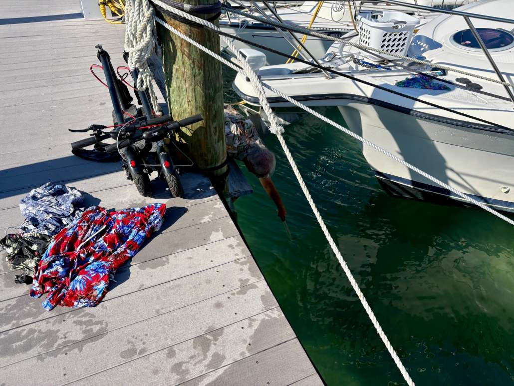 Speaking of laundry…Laundry day is my favorite day. I wasn’t prepared how soggy things can get when living on the water. So, there’s nothing like having fresh sheets, clean dry clothes, and fluffy towels. It’s not a simple process. I have to gather our dirty stuff, have Butch help me get it off the boat, schlep it almost two blocks, pay my $7/load then wait the hour and 45 minutes before I can carefully (so it doesn’t drop on the dirty floor) remove it from the dryer, fold it/hang it on hangers, and schlep it back to the boat. Here’s where things went awry the other day. I handed the clean clothes to Butch on the boat then started to climb onto the boat myself. Butch had put down the laundry and turned around to make sure I was ok getting onto the boat and bam all the clothes on hangers and some towels fell into the water!!! Butch’s initial response was to just leave them on the sandy bottom. I guarantee you, that was NOT my initial response!!! So, this surprise is for all who know me… I did NOT push in Butch so he could dive after our clothes!!! Incredible, I know, right?! But, calmer heads prevailed (after all he did put down the clothes to help me). But darn it, those 4 shirts of mine represented half of the short sleeved shirts I’d packed to last me the entire year. I was not going to give up on them. So, my hero sprang to action, zip tied together two boat hooks, lay belly down on a dock step, and one by one brought up each item of clothing for me to grab. (photo) Even though he salvaged his shirts first, I was happy with the results. We rescued everything that had fallen in except for one brown washcloth. Now I have an unmatched brown towel with no washcloth! Will I ever sleep again?!