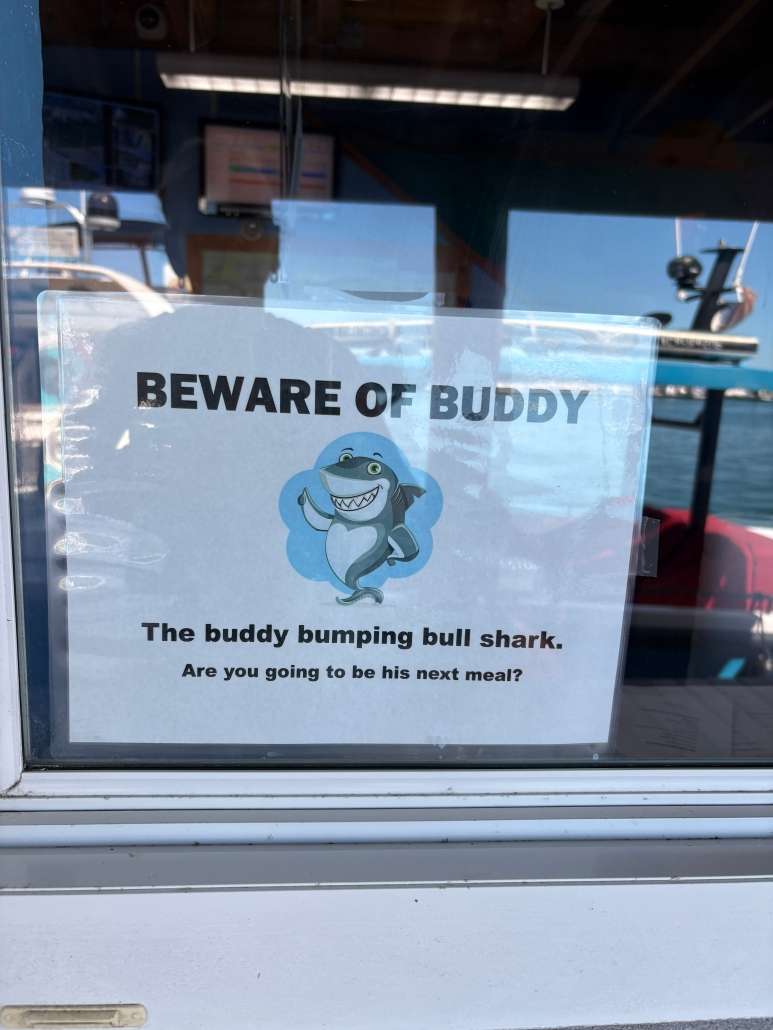 I’m surprised that the 9 foot bull shark that resides in the marina has actually been named by the locals- Buddy. (photo) He circles our boat sometimes and is probably the best reason not to go diving for the elusive brown washcloth.