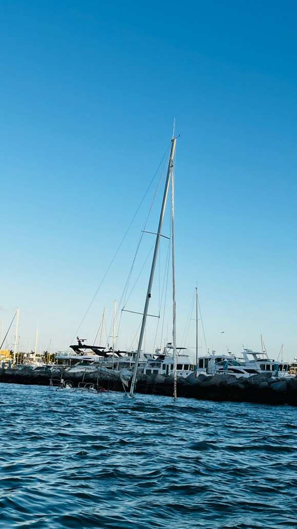 A sailboat that somehow managed to run into the seawall hard enough to hole and sink the boat.