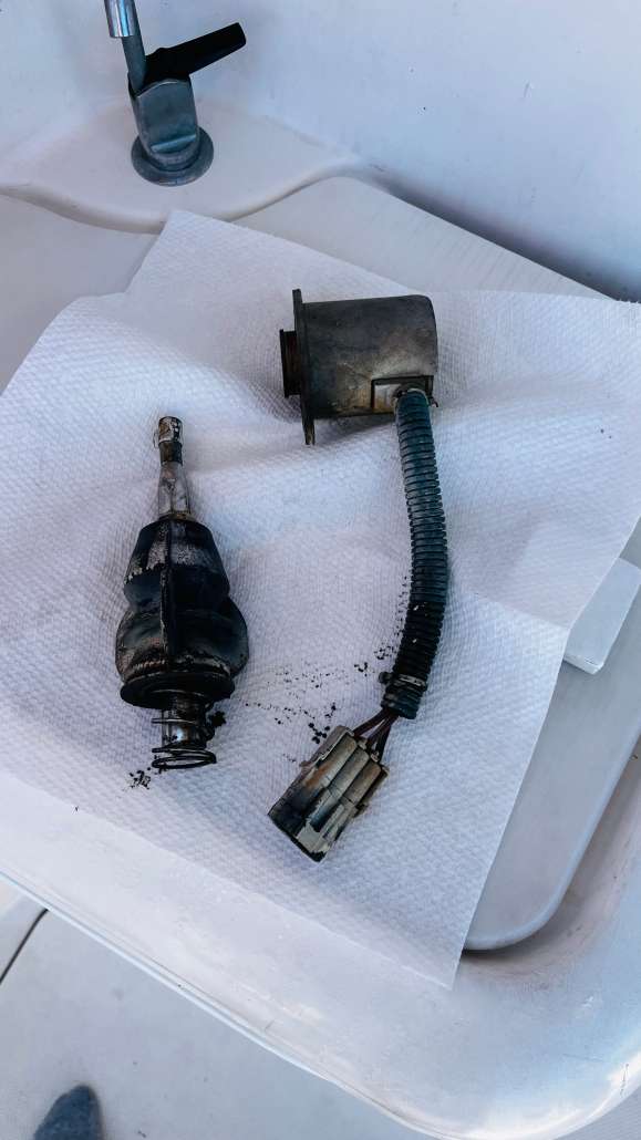 When we got up the morning after anchoring out, the port engine wouldn’t start. Much troubleshooting later and we discovered the fuel solenoid had failed. (Fell apart in two pieces when we removed it.) I can’t get to it, so we had to hire a mechanic out of Key West to swap the starboard one for the port one, so that when I found a new one I could install it on the starboard engine, which I could get to. (It was fun getting into our slip with only one engine!) I put the word out on the Looper forum for a mechanic and a parts source and got a lot of ideas and help; that is one outstanding group. Meanwhile we had to move north as our slip reservations were running out, so I used a zip tie to hold the fuel shut off arm in the on position so we could run the engine. Reminded me of fixing farm equipment in Kansas with baling wire. Finally I had to overnight, from California, a new part, which amazed me is even possible. All is good now, both engines are back online properly, although the cost of the part and the mechanic would take your breath away. Then the battery charger blew up, but that’s another story.