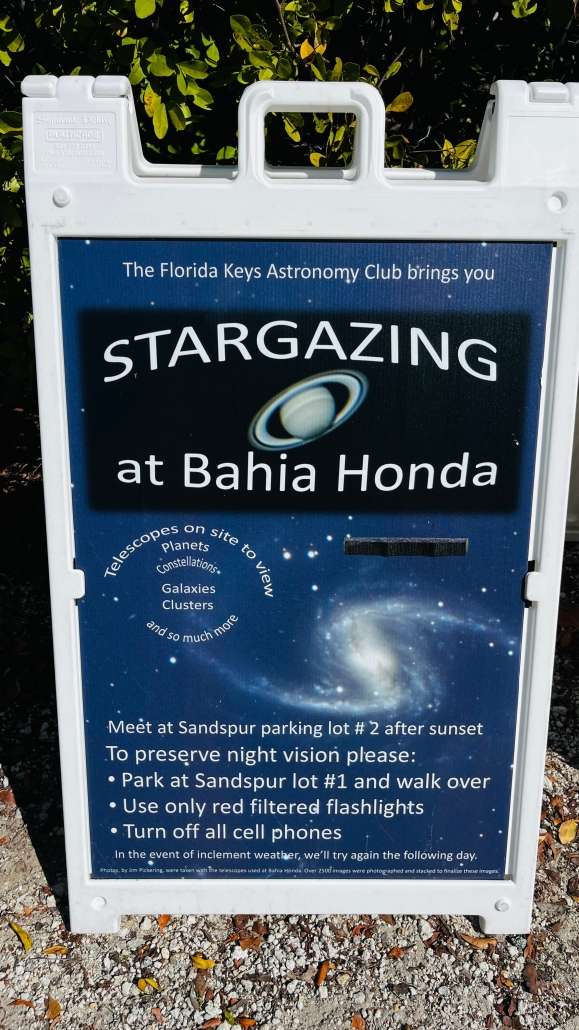 At Bahia Honda there was a nightly star party, which was fascinating. An astronomer had a 35 inch reflector, about eight feet long, on a tracking platform so that we could take turns looking at celestial phenomena as he told us about whatever we were looking at. The guy, Jim Pickering, was great, extremely knowledgeable and excited to be sharing it, and funny. We looked at Saturn’s rings and moons, Jupiter’s cloud bands and storms, the Andromeda Galaxy, a global cluster, and a transit of Jupiter by one of the moons, Jim thought it was Io. You could see the shadow of the moon moving across the face of Jupiter. Jim pointed out that is something that very few people have seen. For most of human history, there were no telescopes so no one saw it, and even now, only a few people have seen it live through a telescope. The viewing was good, it was very dark, no cities nearby, and just a few clouds. Great program, although the no-see-ums got Cheryl pretty bad. The astronomer, Jim, is not always there at Bahia Honda, turns out there is a hugely popular star party coming up on a nearby island and he was there for that.