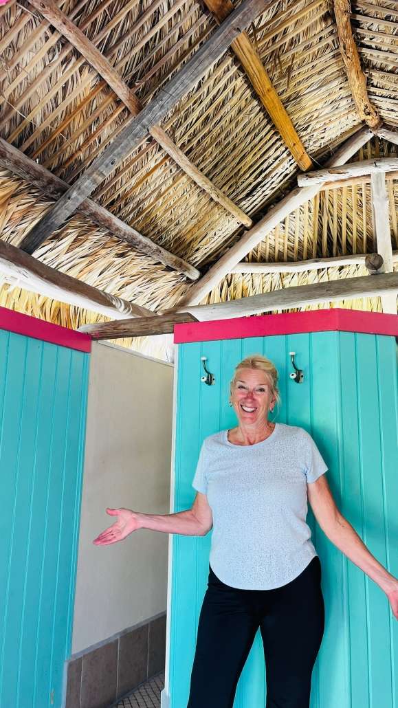 It’s interesting (maybe strange) what I find exciting. Here I am, on a one-year boating trip where every day is an adventure, the scenery is beautiful, and the fun just continues. And yet these bathhouses at Burdines Marina/Restaurant had me excited. I couldn’t wait to show them to Cheryl. They are outdoor tiki huts, open at the roof line which lets a breeze in, and I think just cool as heck. When you are showering you can feel the breeze and it feels great, warm water and a cool breeze. Very tropical. I kind of wish we’d booked a longer stay here just so I could use them a few days longer. (I told Cheryl that now I want to build one in the back yard.)