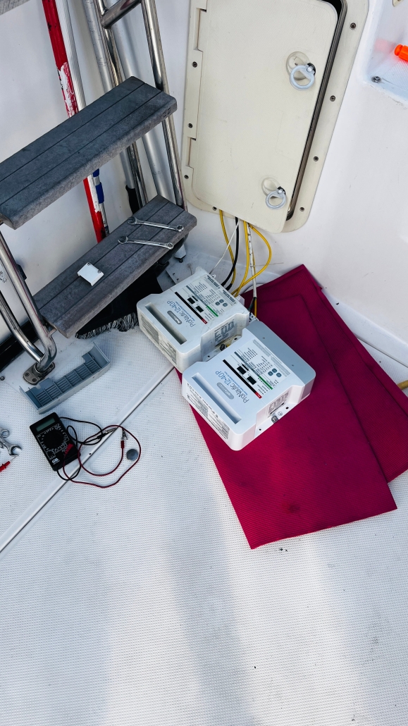But it’s a good story, so I have to tell it. The battery charger, which keeps the house bank up, which keeps the refrigerator running, made a pop and spit out a cloud of black smoke. Oops. We were two nights out from a dock with a power supply; fortunately the solar panels I installed kept the batteries full so we were fine. A couple of phone calls and I found a replacement nearby at a West Marine. We come in to Cooley’s here and two guys catch our dock lines. I ask them if one of them has a car and could run me to West for the charger. Sure enough, the guy living on the boat next to me was willing. Turns out he’s a pro boat mechanic with a business here, and he used his West Marine Pro discount when I bought the charger, which lowered the cost from $780 to $580. And he wouldn’t even take any gas money. So tonight we’re buying him and his wife pizza from their favorite place. So like I said earlier, this whole experience keeps you purely in the moment. Most of the time you can’t plan more than five minutes ahead and yet, like this, it works out every damn time. Amazing. I had the new one installed in 45 minutes.