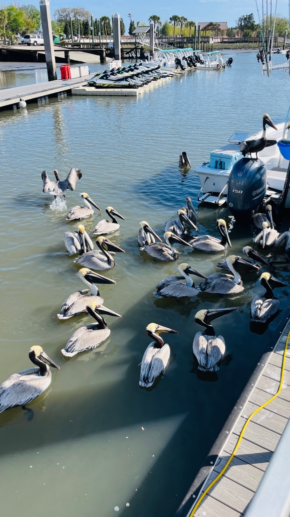 We just pulled into Georgetown, SC, (another great stop!) after another uneventful 65 mile/7 hour passage. (Cheryl has a different view about our Charleston passage, see her comments below.) We talk on these passages, listen to music, watch the dolphins fishing, pass boats, eat, drink coffee, marvel at the homes we see, both the mansions and the shacks, and talk some more. Really hard work and exhausting. Not! We are here for two days, then on to South Myrtle Beach where we hear fuel prices are the best in the area. We’re working our way up the coast with hopes and plans of arriving at Norfolk May 1st or before. We’ll attend the AGLCA rendezvous there, hopefully picking up all kinds of great information about the next leg of this crazy journey, including the Chesapeake, Great Lakes, and Canada, as well as meeting up with Looper friends and making some new ones. (Side note: We had noticed, as did other Loopers, that the dolphins here don’t play in the boat’s wake like they do in Florida. On one of our tours, we learned that dolphins, while the same species, have different ethnic groups, which speak different languages and behave differently, and yep, the inshore east coast dolphins are very territorial and don’t surf boat wakes.) I have also noticed that while there are still gorgeous live oaks here, we’re too far north for Spanish Moss, so they look kind of bare.
