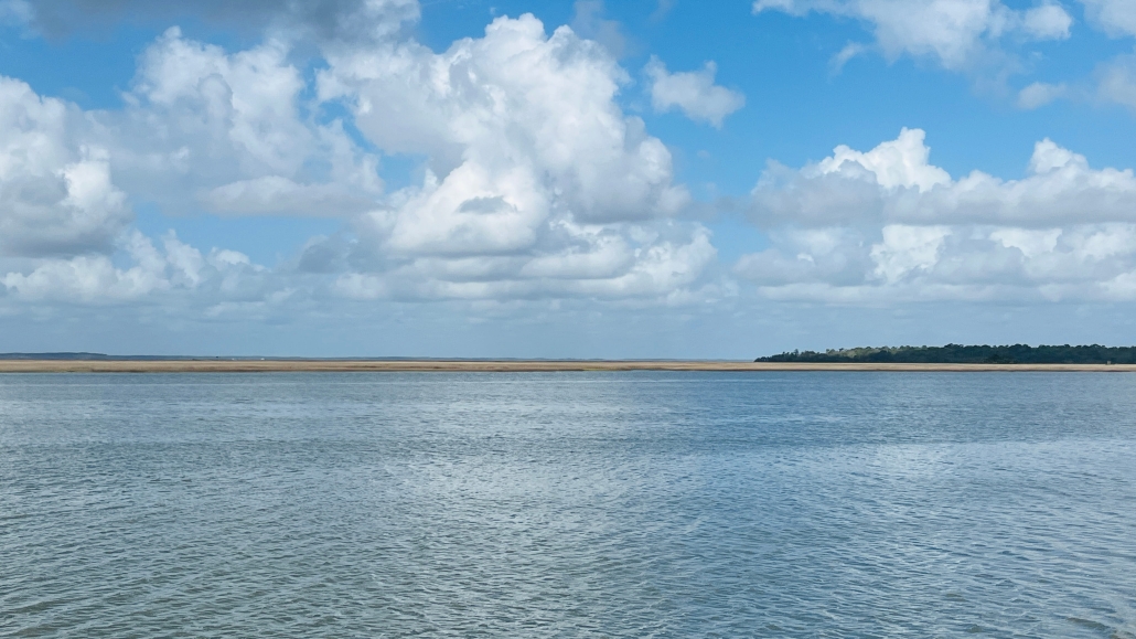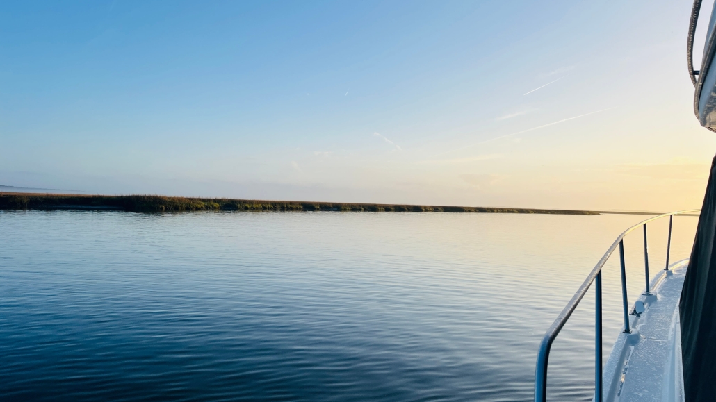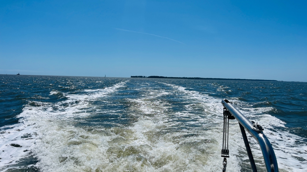 When the waves of one inlet finally calmed down, I was still trying my best to stay in the channel. Butch ventured outside to pour freshwater over the windshield to get some of the salt off, allowing me some visibility. A relief for sure. Butch then proceeded to the upper helm to check something- I’m still trying to stay on the sail line. But uh oh. There’s an island of seagrass in front of me. Of course the sea grass doesn’t show up on my GPS. Do I keep it on my right- or left? I chose right. I was wrong. I realized the error of my ways in plenty of time to turn the boat the other way. But not soon enough to save Butch’s favorite cap (from Interlochen) from taking flight off his head and becoming fish fodder when he rushed down to correct our course and the wind caught it.