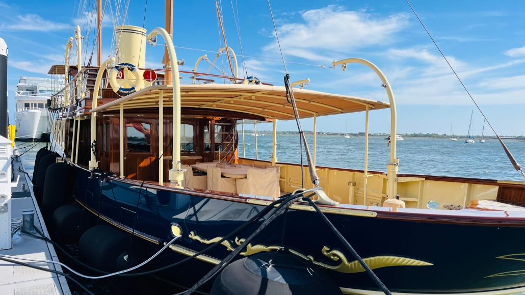 We pulled into Charleston after an uneventful passage, although the wind was blowing like stink, (which means 25 gusting to 35) but we drove from inside most of the day so didn’t really notice, other than some lumpy seas crossing the sounds. However, we got to the mega-dock in Charleston and they put us on the east end, closest to the swells coming in from the ocean and totally unprotected. As you can see, that’s not gonna work. We couldn’t even stand up, much less rest or sleep. So we asked for a better spot and they moved us to the other end of the mega-dock, about a mile away, inside, and protected. Way way way better, and much appreciated. This marina is one of the most accommodating we’ve been to, they don’t have loaner cars, they have a shuttle that picks you up on demand. Very nice! The mega-dock is just amazing to walk, it’s 1530 feet of unbelievable yachts.