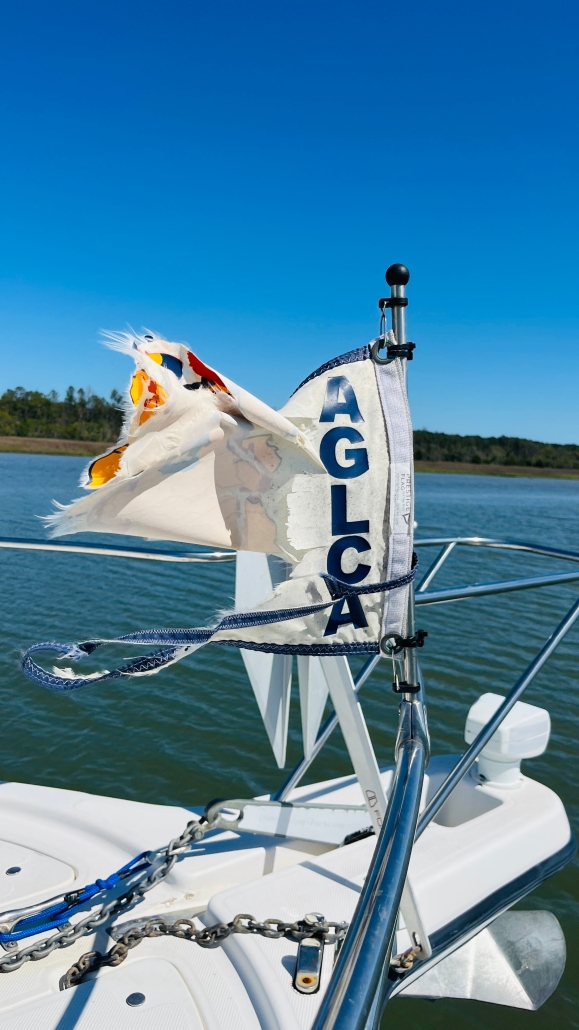 Cheryl: OK, so I have to be brutally honest. Let’s discuss the “uneventful passage” from Beaufort to Charleston that Butch mentioned. I started out the morning wearing two pairs of pants, two shirts, socks, tennis shoes, a winter jacket, and leather gloves. It was 52° outside with 25 mph winds with wind gusts up to 35 mph coming right at us. You do the math. We tried to drive from the upper helm, but it was too cold and too windy so we drove from inside.