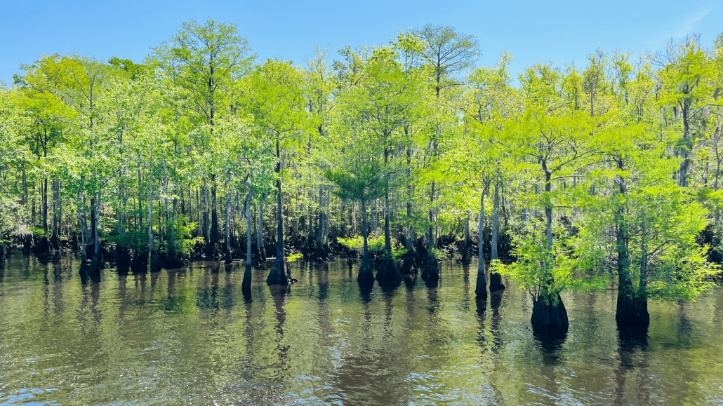 Coming around and then up the coast was interesting as we watched the terrain go by. Florida was beaches, mansions, and condos, Georgia was vast marshlands. South Carolina and into north Carolina was bald cypress trees and what sure looks like alligator habitat, although we still haven’t seen one. Had a nice visit in this area with Ellis and Alauna while we were at Osprey Marina near south Myrtle Beach, they gave us a ride to lunch and helped out with some boat parts I had shipped that got there late. Thanks!