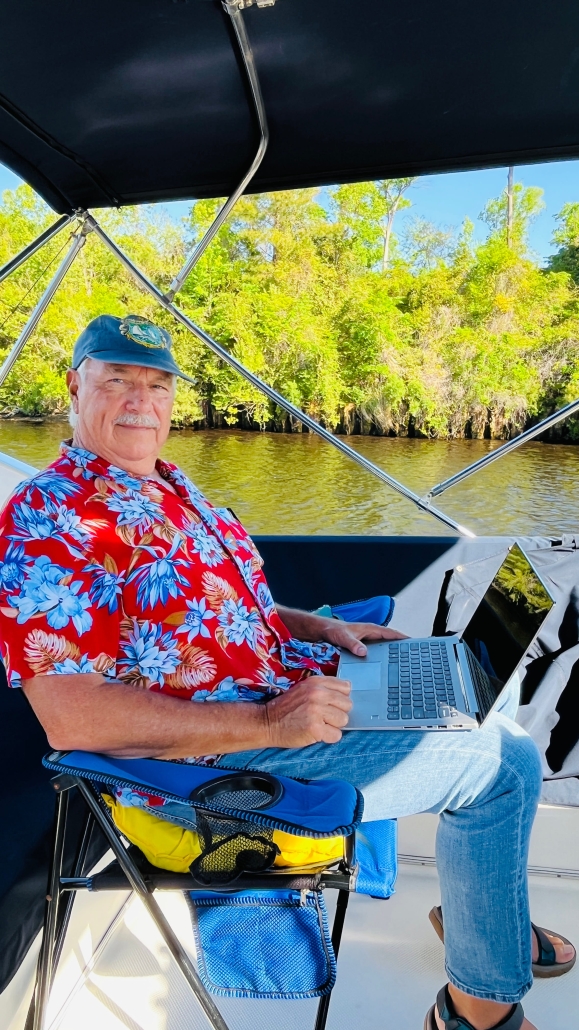 Never would have imagined this scenario….rolling down the river, (well, the intracoastal waterway), making enough to buy the next tank of diesel with a laptop and a wifi connection. Technology is great. (Sometimes. I will always be something of a Luddite.)