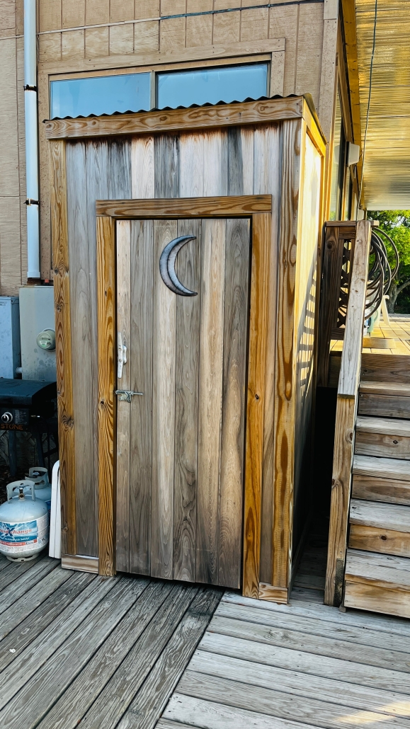 Y’all remember my description of the wide variety of the showers at all these marinas? That continues. Here’s our last two stops. One in an actual wooden outhouse, wood grate on the floor for a drain, mere steps from a restaurant entrance, one dim light so it was hard to see at first until your eyes adjusted, and no good place to hang your towel or clothes. The next stop had this modern, clean shower/bathroom.