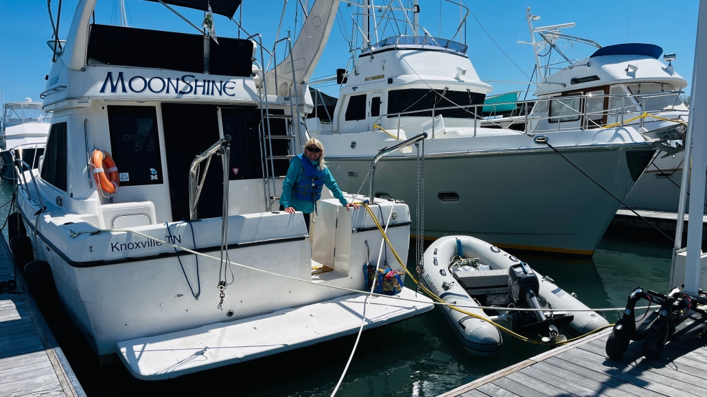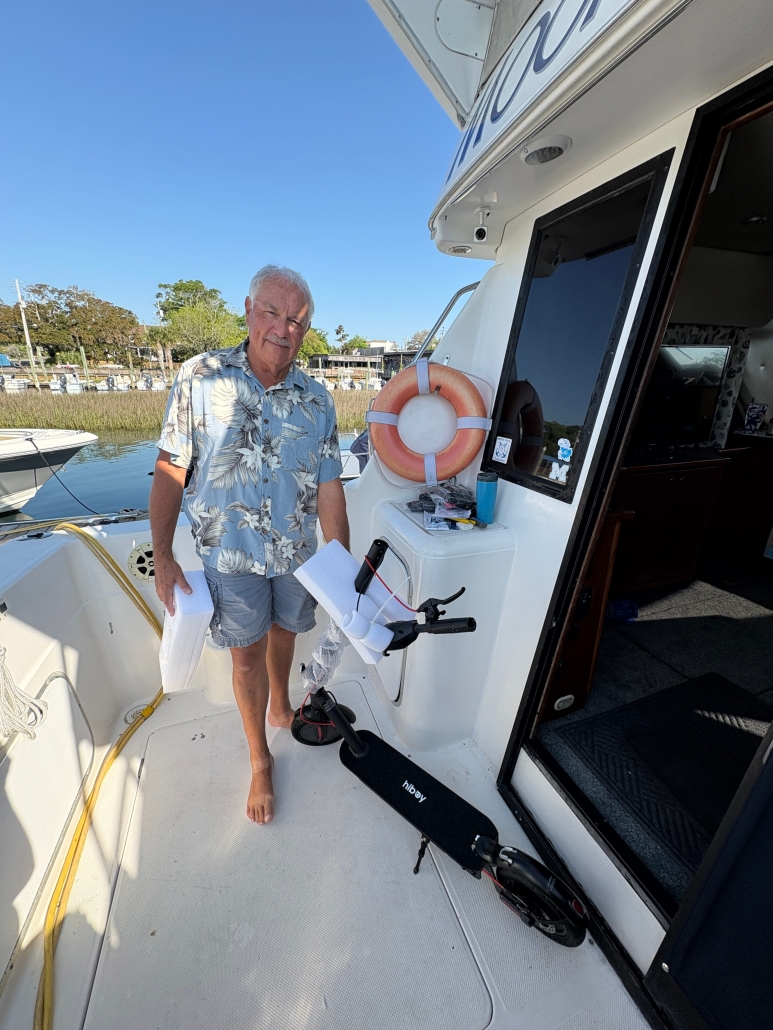 We have wheels again! After that unfortunate incident with the salt water, and two unrepairable scooters, our new ones made it in. Thanks again to Cheryl’s friend Jeff in Wilmington for helping us get them to the boat.