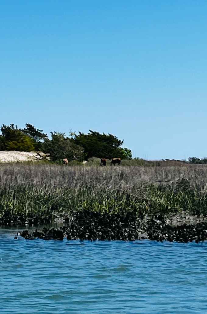 Just an ok picture, we couldn’t get too close because look at that shore! Solid sharp oyster shells. If you look under the trees you can see three horses.