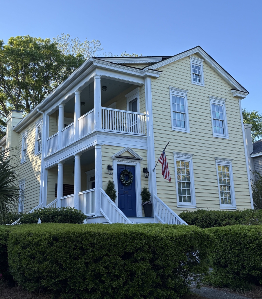 Cheryl was intrigued by this style of home. The street-facing side of the house is the narrowest, as that is how taxes used to be calculated, on frontage. So the front door actually opens to the porch, not the interior, so that the occupants could use the front porch as a living room or even sleep there.