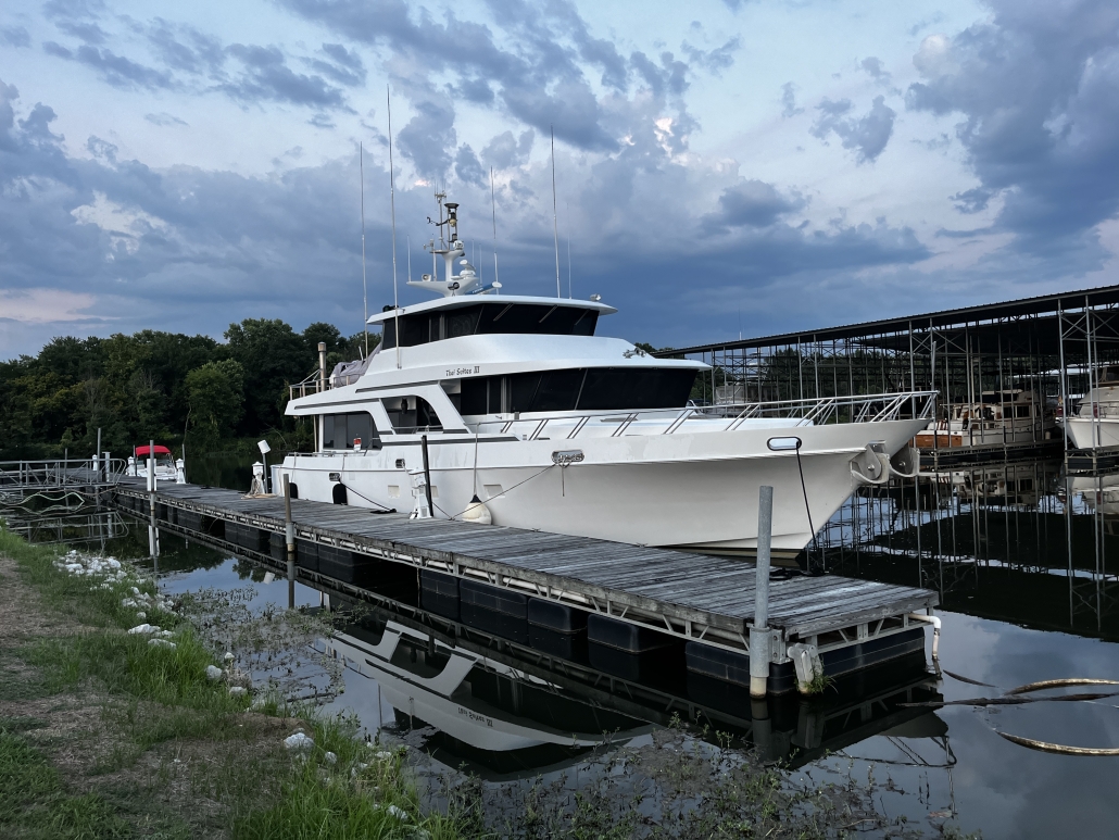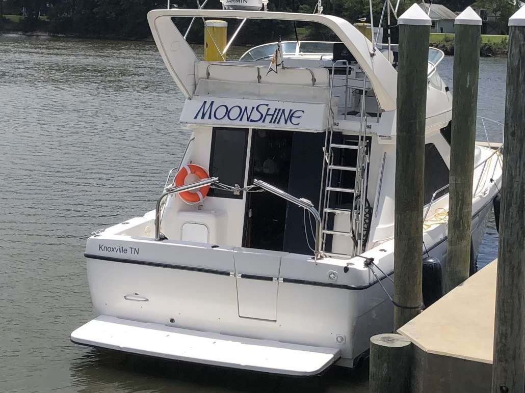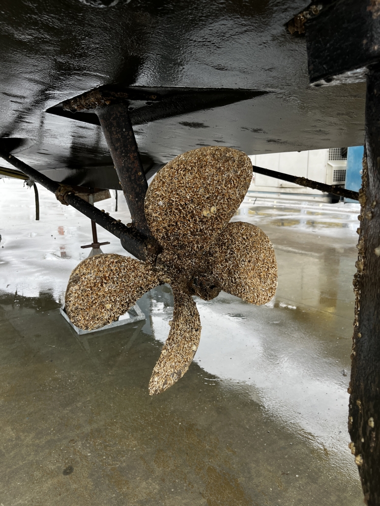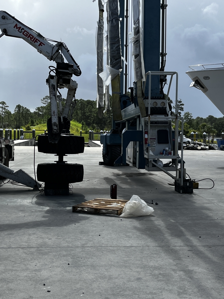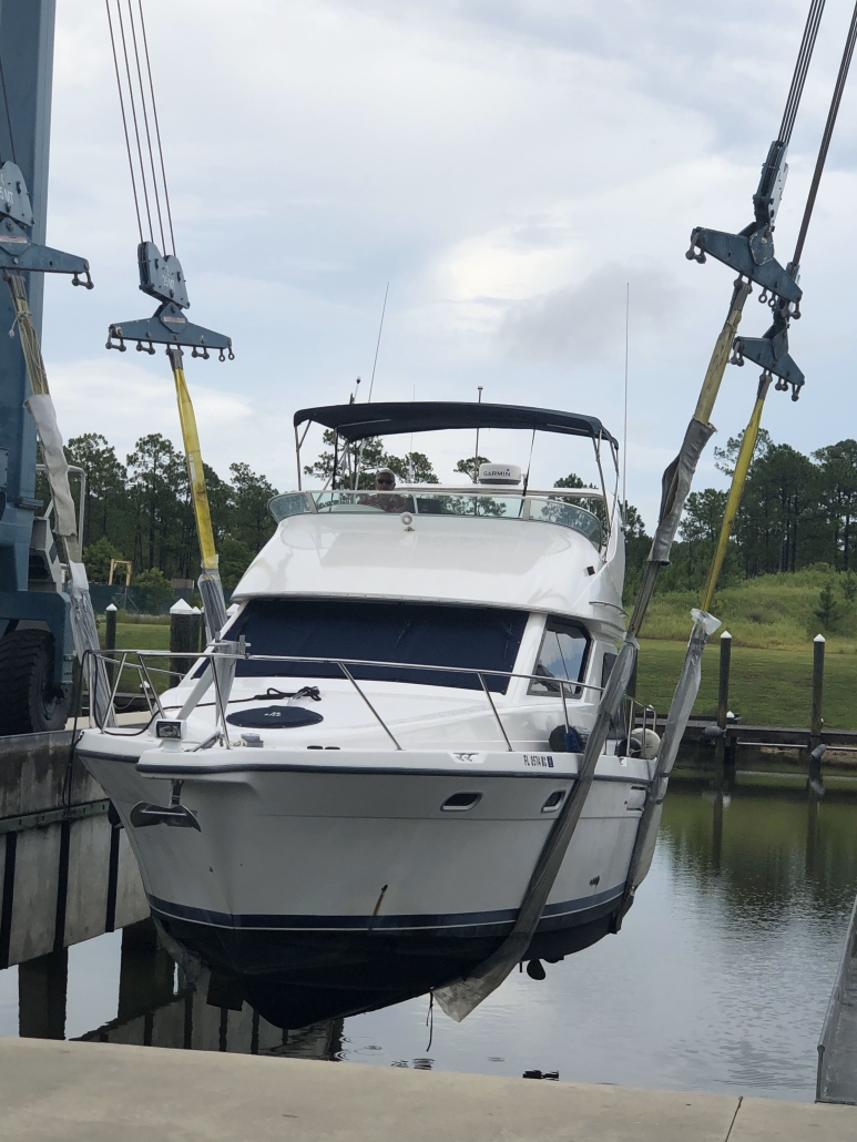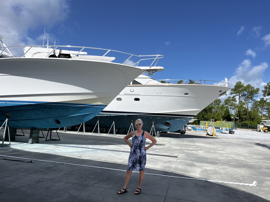 We made it six miles. When we got out of the intracoastal waterway and into Mobile Bay, which is far bigger than you might imagine, (you can barely see the shore from the middle, which is crazy) I hit the gas to get up on plane. Nothing but smoke. The engines were trying, but something was choking them back. My first thought was the air filters, which I had re-oiled. Maybe I used too much oil? So I shut down and pulled them. Tried again. Nope. The only thing left was the propellers. Rope again? We had no vibration so probably not ropes around the props again, like we had in Clearwater. So once again, on with the scuba mask, into the water and under the boat. The moment I touched a prop I knew what it was. The boat had sat so long in the marina, two and half months, the props were covered with growth. Barnacles. So we limped back and called several places to see about getting pulled and cleaned up. There was a big fishing tournament going on that week and the soonest they could get us in was in two days. Ugh. So we spent the time tied to the docks at Saunders Yacht Works, using the employee break room and marveling at the huge boats there. Then the boat lift had a flat, which took them a day to fix. Ugh. We did get “Knoxville TN” on the back of the boat. Here’s a few pictures from that ordeal. As you can see, some of the boats were massive!