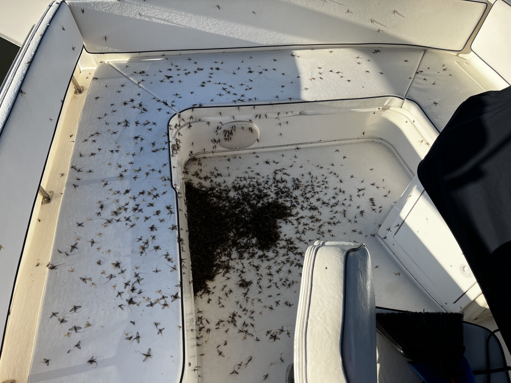 However, it wasn’t all roses. We anchored out on the river a few times but twice we woke up to BUGS! Once it was fishflies, or mayflies, the second time it was little white moths. The anchor light attracted them. This photo is before I even took a broom to it.