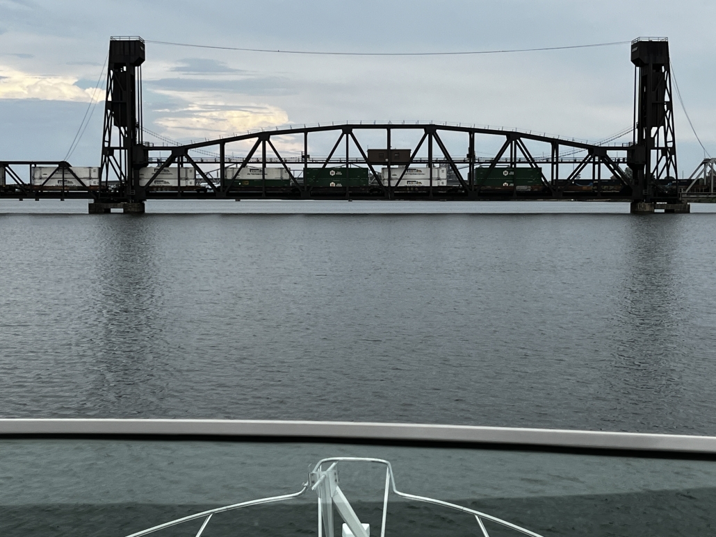 A railroad bridge, one of two we had to call on the radio and ask them to raise. They did, although we had to wait for the train to go across.