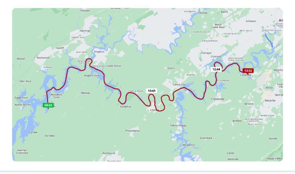 Pensacola FL (actually just a couple of miles west of there, at Elberta, AL) to Knoxville TN, by river.