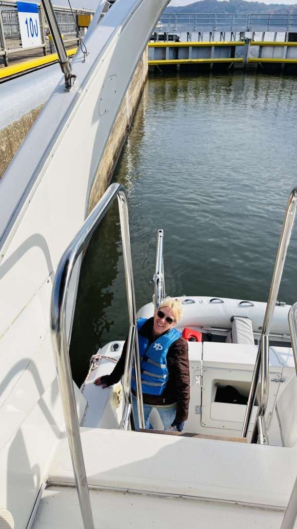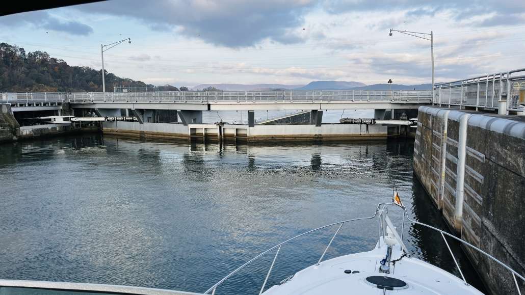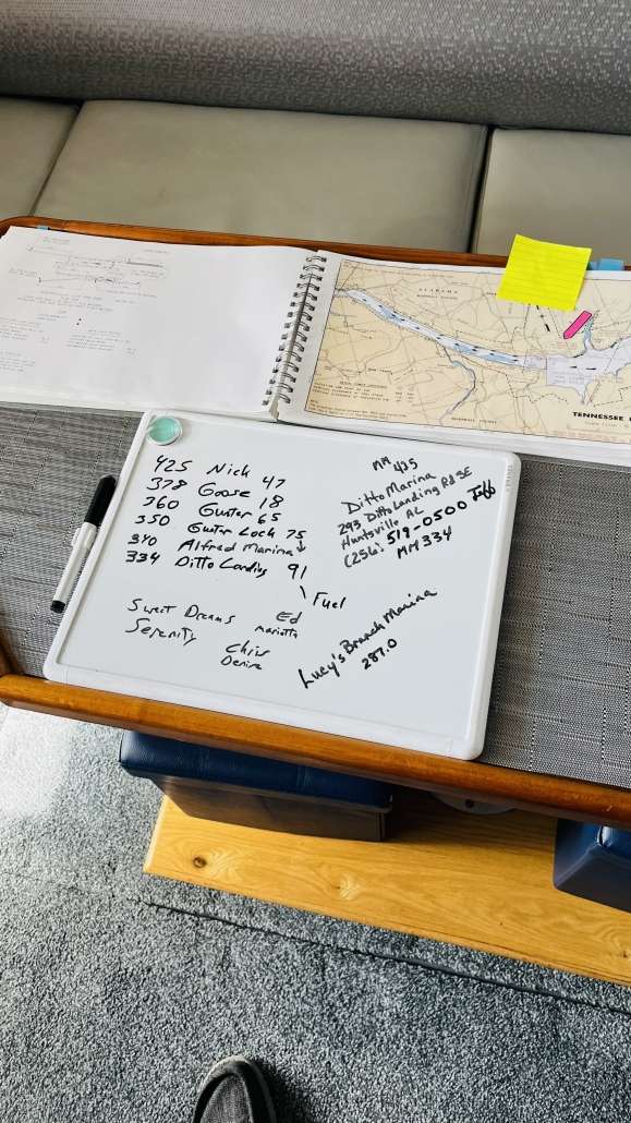 We are sitting at Ditto Landing marina just south of Huntsville AL, waiting out a cold front and taking a day off. All is well, however the transition from land life to boat life is a significant one. It really is kind of like living on another planet. The excitement and the sheer number of new experiences kind of wore us out, so a day off feels good. We also are dealing with not one but two time changes, first was daylight savings time kicking in right before we left, then we crossed the Central time zone and promptly lost another hour. So when we woke up at six this morning it was really eight by our biorhythms! It does help us get off to an early start, but 9 pm is really 11 pm so by the end of the day we are done. No complaints though, it’s all good, just a bit of an adjustment to get used to. This blog will probably be a little different from here on out, we won’t have time to write as much (How did we manage to write 28 posts before we have even left?) but we will post pictures and some details when we get a chance. Starlink is working like a champ, full internet access all the time which is nice. Radar works too, thank goodness, we got caught out in some fog one morning and it was zero visibility. We just went channel marker to channel marker along the edge of the river (dead slow) till it cleared.