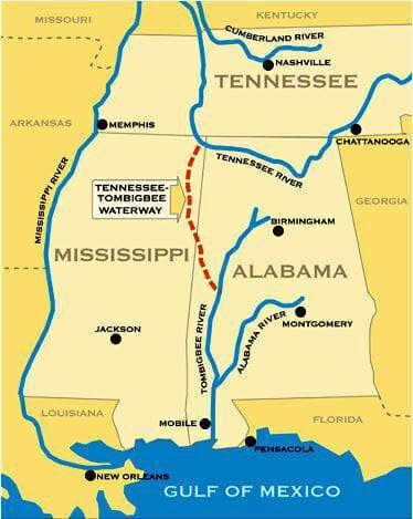 The waterway itself, in red on the map, 234 miles long, built over 8 years, opened in 1985, connects the Tennessee river with the Tombigbee River, allowing a tremendous shortcut to the port of Mobile, AL and then the Gulf. The waterway was one of the biggest earth-moving projects in history, bigger than the Suez or the Panama canal projects. It is one big ditch!