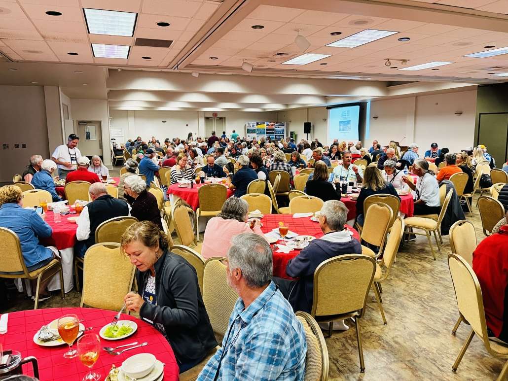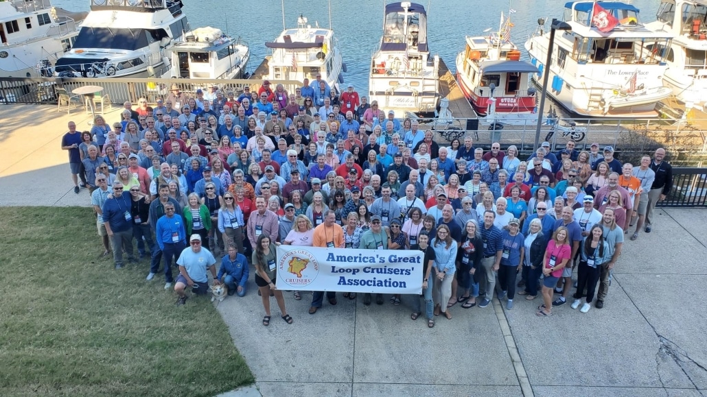 Which took place at Joe Wheeler State Park in Alabama. It’s a huge state park, with camping, cabins, a big marina, a lodge, all the “stuff” a state park has. It’s a typical state park operation in that everything is a little run down, maybe a little dirty, functional but not exceptionally high class. The Great Loop organization, however, is one of the best run and most enthusiastic associations I’ve ever come across. The whole point is to facilitate and dispense information about doing the Loop and man, do they do a good job. The presentations were informative and entertaining; I took so many notes it’s going to take me days to go over them here at home. Everyone was super friendly and full of questions. It was fascinating to meet so many people and see all the different ways they were going about doing the Loop. We all wore name tags with either “completed” “in progress” or “planning” on it so that people knew your Loop status. We met lots of retired or about to retire couples, including a 75 y/o guy, just divorced after 43 years, who was just getting started and isn’t planning on actually leaving on the Loop for several more years, which means he’ll be almost 80. I hope I’m still planning adventures at 80!